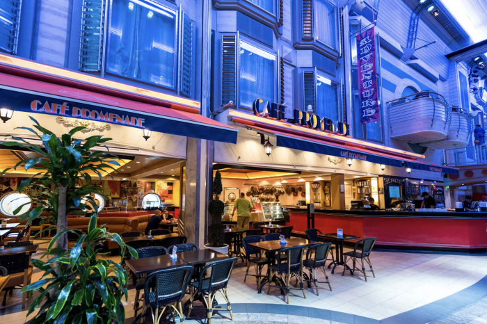 When it comes to quick and easy come-and-go eats, there’s no better place than Café Promenade. This casual, complimentary hotspot bustles 24 hours a day, so you can drop by any time — whether it’s for coffee, snacks, pastries, and sandwiches, or the best people watching on the ship. (Additional charge applies for specialty coffees).