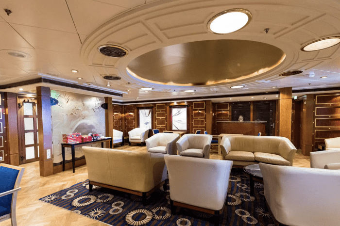 On top of the world on Deck 14 overlooking the high seas, Viking Crown is the ultimate spot to soak up panoramic views while you sip your favorite cocktails. Catch the sunset through its floor-to-ceiling windows, then stick around as the space comes alive with the sounds of live entertainment, flashing strobe lights, and plenty of action on the dance floor.