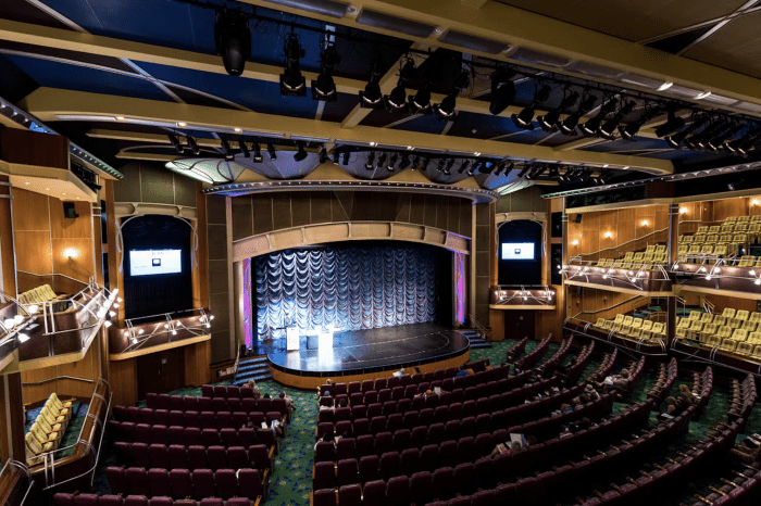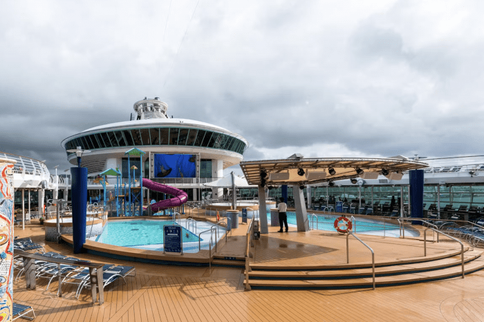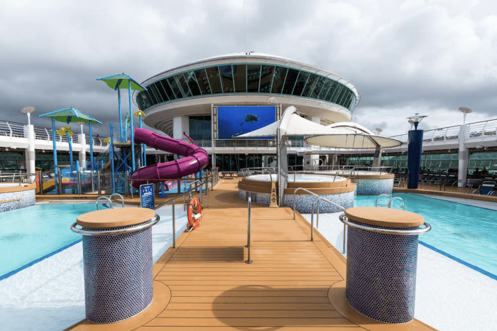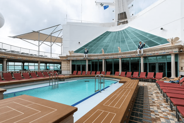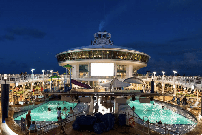 The ship’s large outdoor movie screen, located on deck 11 above the pool, airs your favorite movies under the stars.