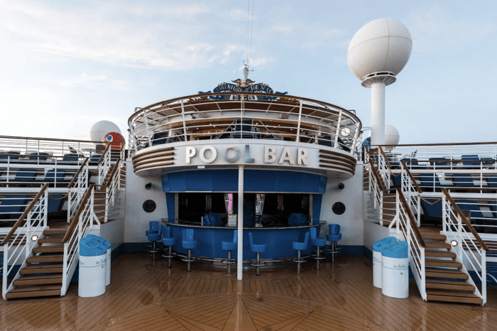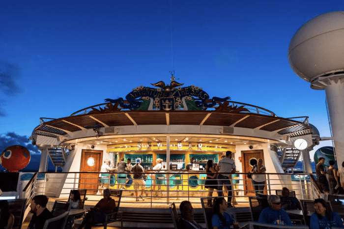 You don’t have to stray too far from your comfy poolside lounger to enjoy a cool piña colada, a tropical Mai Tai, or your favorite ice-cold brew. Overlooking the action on the pool deck, Sky Lounge provides a full menu of cocktails, beer and wine, as well as a bit of shade. The drinks flow, the view is spectacular, and the action is close.