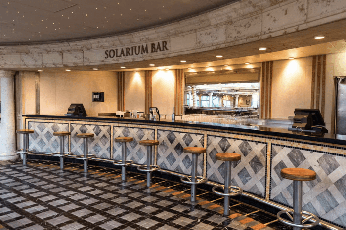 Discover the Solarium, a relaxing indoor-outdoor retreat. Perfectly positioned at the front of the ship, the crystal canopy area presents fantastic views while you enjoy swimming pools, whirlpools and lounge area.